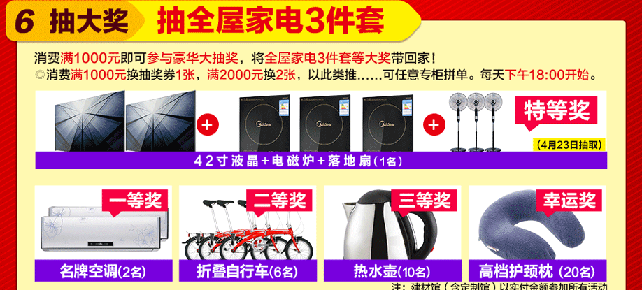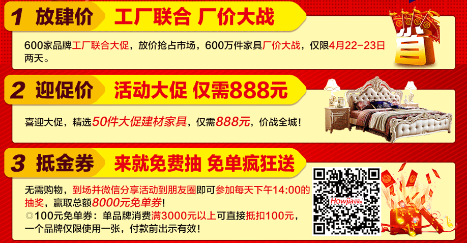 活动介绍: 4月22-23日,红树湾家具广州城区4店联手好家网举办“放肆大促 价战全城”大型促销活动火力全开,惠动全城!本次活动,600家品牌工厂联合大促,600万件家具厂价大战!活动期间,您来购物即可畅享家具建材最底价!购物满额即送iPhone7、冰箱等豪礼,还有满额返现金等着您;更有豪华大抽奖:42寸液晶、名牌空调等家电等您来赢取!红树湾番禺总店,以真诚好礼,优质服务,高质产品,超低价格,迎接您的到来!