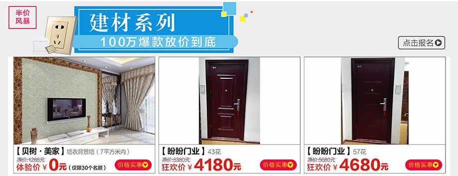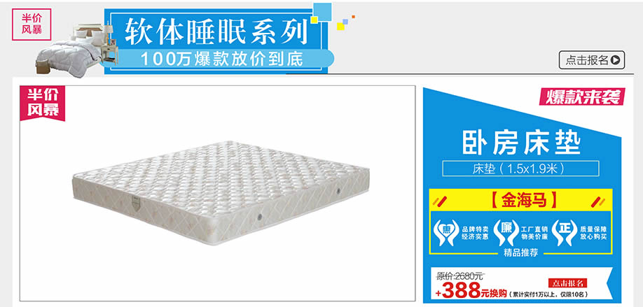 活动介绍: 羊城劲爆好消息,4月22-23/4月29-5月1金海马家居花都店举办【五一•半价风暴】的大型促销活动,活动期间,200品牌家具建材工厂驻点直销,100万爆款放价到底,再享多重钜惠,震撼全城!抓住机遇,乐享不停;开单抢888元现金红包;砸金蛋赢豪礼,100%中奖;还有10000元免单大奖连环抽!更有欢乐大抽奖:55寸液晶电视、三门冰箱、洗衣机等全屋家电疯狂送;买了好家具、好建材,还有豪华礼品拿,就是爽!马上报名参加活动,提前锁定优惠!