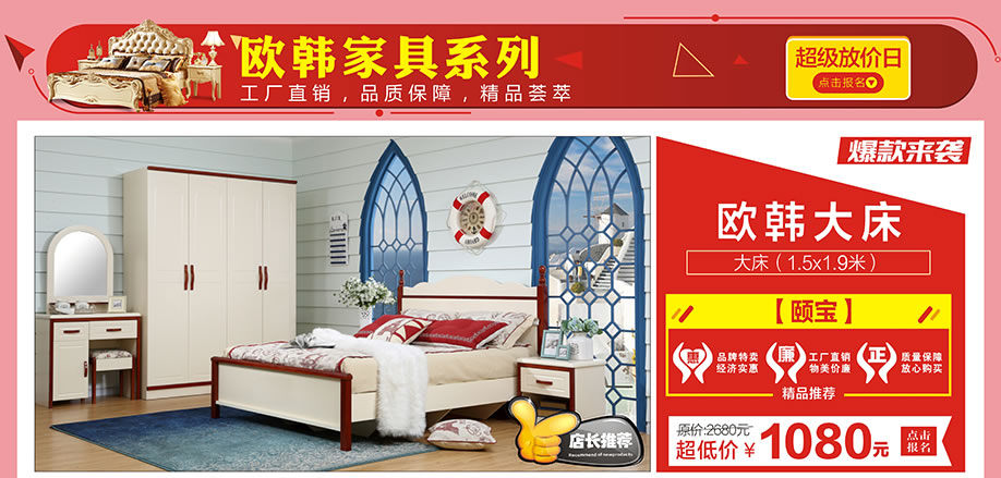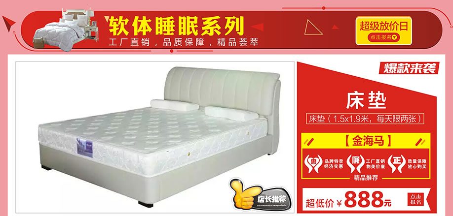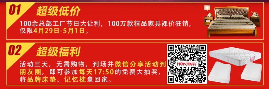 活动介绍: 激情庆五一,全民享实惠!4月29-5月1日,皇庭家具广场联手实惠家举办【家具·五一超级放价日】大型促销活动。活动期间,100余总部工厂节日大让利,100万款精品家具裸价狂销!活动三天,来就免费抽品牌床垫;狂享1000元返现;满额即送iPhone7、40寸彩电等2000件豪礼;还有55寸液晶、空调等大奖等你拿!五一大手笔,一省到底!马上报名参加活动,提前锁定优惠!