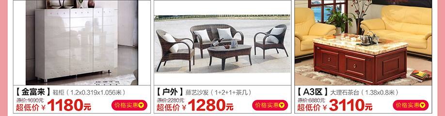 板式板木家具:健威、柚乐居、华日明珠、时尚美居、红棉树、健邦、美加美套房、幻彩之家、骏豪、佳林、百得瑞、城市恋人 睡眠软床:金海马床垫、路易狮王床垫、穗宝、雅兰、威尼诗软床、海马国际 真皮家具:蓝岸丽舍、施华洛、维伦堡、罗图沙发、宾诺沙发 实木:东方家庭、易森、森柏源、裕丰家具、金樟居、棹美轩、海菲家具 欧式/韩式:颐宝、天鹅城堡、和风轩尼诗、亿品优美 儿童:我的E家、森林夏娃、幻彩之家 定制:欧莱克、新尔斯、科麦衣柜 红木家具:雍博堂红木 办公家具:国景办公家具、美格利生办公家具、添雅办公家具 户外:鸿福金门 其它:皇庭布艺窗帘、雅亿阁精品
