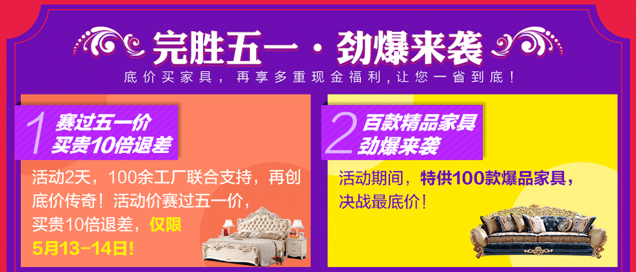 活动介绍: 5月13-14日,香江家居旗舰店联手实惠家举办【家具品牌厂购日】大型促销活动,活动期间,100款爆品家具,完胜五一价,全城狂欢!活动2天,1000份见面豪礼来就送!砸金蛋赢现金大奖,100%中奖!最高可中现金688元!再狂抽现金红包,1000元现金等您来领!还有1888元清凉基金等您来抽!底价买家具,再享多重现金福利!5月13-4日香江家居旗舰店,让您一省到底!