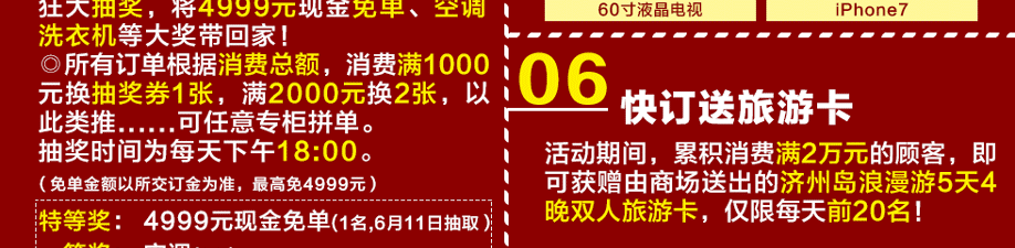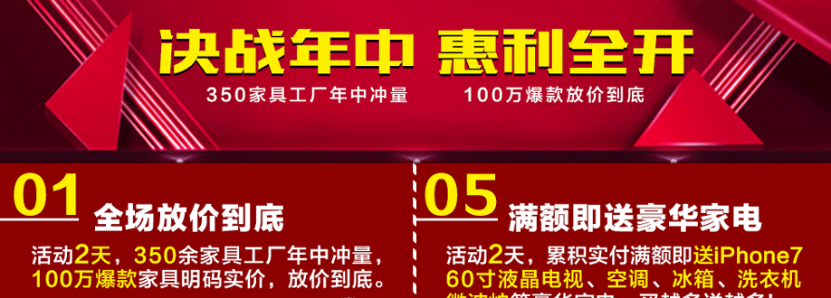 活动介绍: 没有大优惠,绝不惊动您!6月10-11日莞城光辉家居【家具年中大促 疯狂到底】劲爆来袭!350余家具工厂年中冲量,100万爆款家具明码实价,放价到底!【免免免】来就免费抽品牌床垫!【赠赠赠】满额即送60寸液晶电视、空调等豪华家电!【抽抽抽】还有4999元、洗衣机等大奖等你带回家!【送送送】再送济州岛浪漫游5天4晚双人游!钜惠不容错过!快上实惠家报名参与活动吧!
