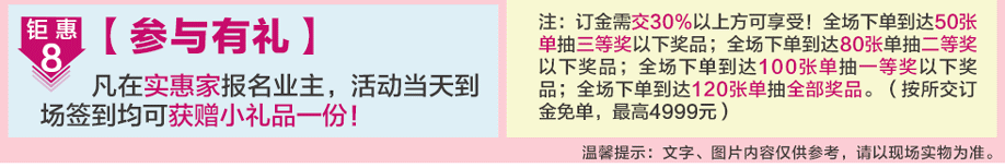 特别提示:应举办方规定,实惠家是本次活动唯一指定报名登记渠道,所有参与业主须在本页面(顶部)报名,方可享受活动的所有优惠,活动前会有客服致电告之详情。查询报名成功与否可致电13728114491→