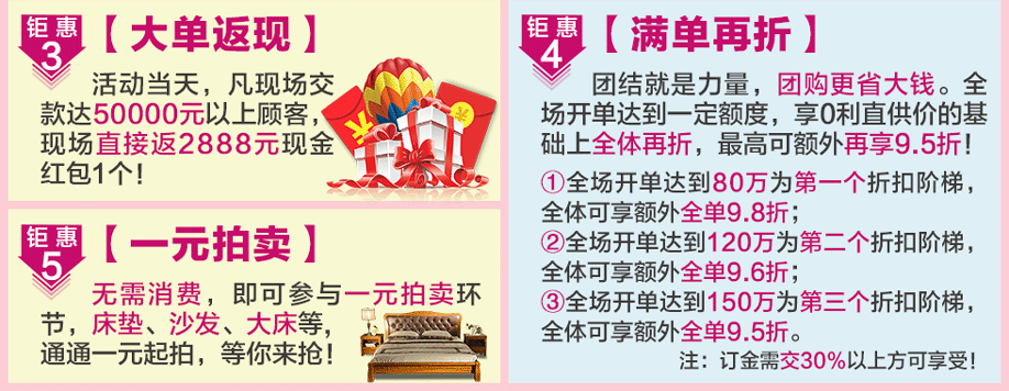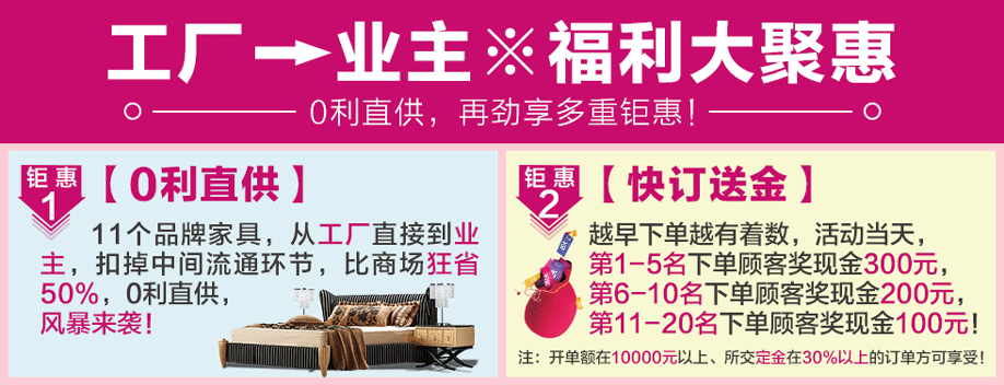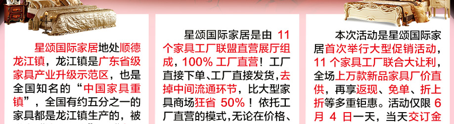 活动介绍: 6月4日星颂国际家居首次联手实惠家举办大型优惠促销活动!星颂国际家居为11个家具工厂联盟展厅,产品覆盖美式、欧式、中式、实木、板木板式、客厅沙发、儿童家具等一站式家居!本次活动由11个品牌工厂直接到业主,扣掉中间流通环节,比商场狂省50%,0利直供,再劲享多重钜惠!快订再送300元现金红包;大单再返2888元现金;全场开单满额,再享最高9.5折;再抽免单4999元;还有+99元换购豪礼以及1元拍卖等环节!无需犹豫,赶紧在实惠家报名锁定优惠折扣吧!