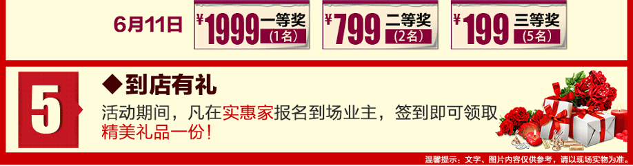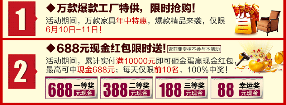 活动介绍: 年中家具大狂欢!6月10-11日,香江家居旗舰店联手实惠家举办【家具年中大惠战】大型促销活动!活动2天,数万爆款家具工厂特供,限时抢购!千份见面豪礼来就送!特惠1:砸金蛋赢现金大奖,100%中奖!最高可中现金688元!特惠2:狂抽现金红包,1000元现金等您来领!特惠3:总额7000元大免单等您来抽!更多惊喜等着您,快上实惠家报名参加活动吧!
