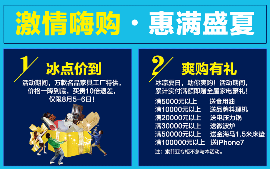 活动介绍: 号外号外!8月5日-6日,香江家居•旗舰店【家具工厂直销日】冰点促销给您降温啦!本活动由万款名品工厂特供!降价到冰点,限时抢购!钜惠到家,惊喜联合放送!惊喜一:满额即送iPhone7、名牌床垫、微波炉等多重好礼!惊喜二:幸运大转盘抢688现金大红包!惊喜三:满额还有3888元返现抽奖活动!万款名品工厂特供家具任你挑,还能赢好礼!心动就来实惠家报名参加吧!