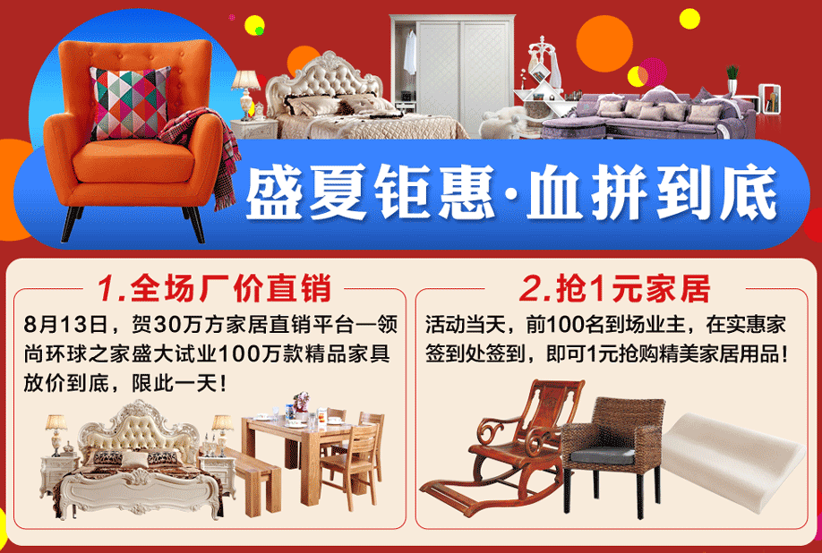 活动介绍: 燃爆啦!8月13日佛山·领尚环球之家【30万方家居工厂联盟直销平台 盛大试业】暨家居生活MALL购物嘉年华启动!千家工厂联盟,万件产品任你抢!来领尚环球之家,给您一站式家居购物服务体验!活动期间,不仅满足您的家居产品选购,还有惊喜好礼等着您!豪华轿车、三门冰箱、电饭煲等豪礼一一等您领回家!看家具,享豪礼!还有1元抢购精美家居用品等着你!喜事多多,特惠多多!您还有什么理由不来!快上实惠家报名参加活动吧!