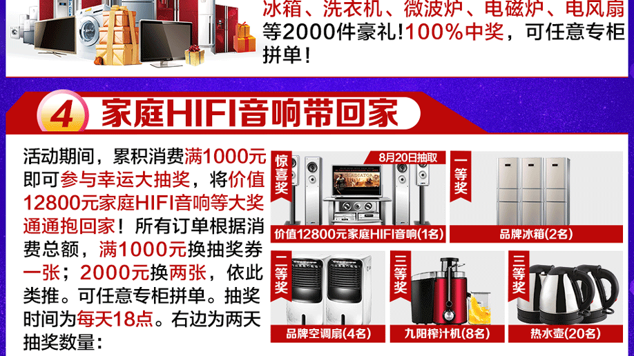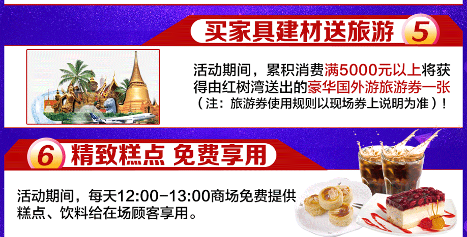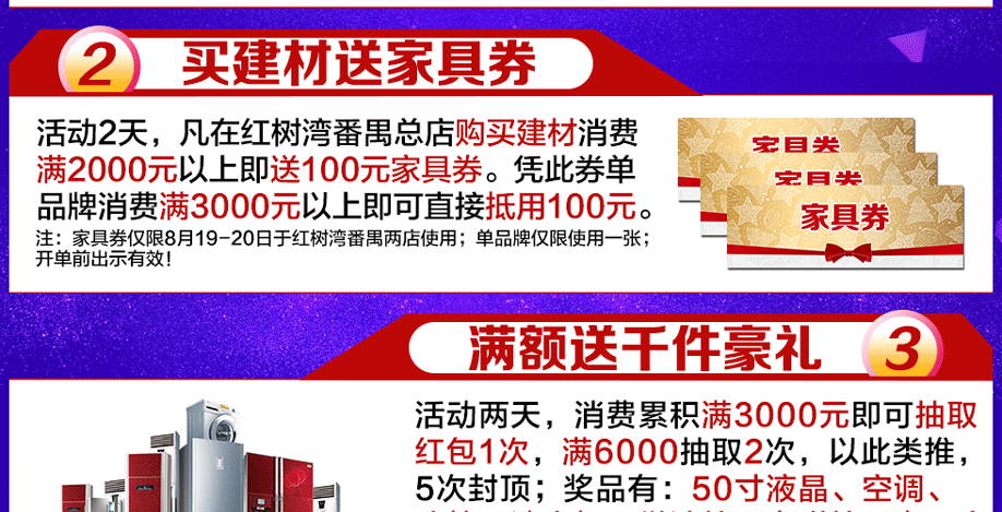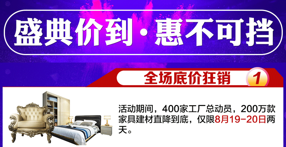 活动介绍: 优惠源于让利,大促就在此刻!8月19-20日红树湾番禺两店联合好家网举办【家具建材狂销盛典】大型促销活动!品牌家具低价钜献,满城特惠狂野来袭!红树湾番禺大道店蓄势待发,决战低价!活动期间:①买建材满额即送100元家具券!②消费满额即送50寸液晶、空调等千件豪礼!③累计消费满1000元既有机会带走价值12800元的家庭HIFI音响!优惠多多!还有国外旅游券相送!千万不要错过!8月19-20日给您重重钜惠、惊喜不断!快上好家网报名参加活动吧!