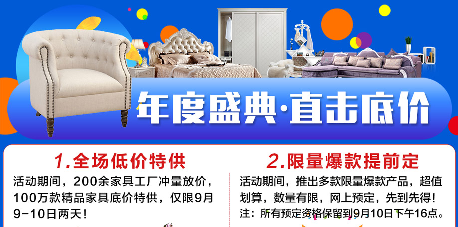 活动介绍: 惠你联动!狂猛降价嗨翻天!9月9-10日光辉家居万江店优惠让利,与实惠家联合举办【家具狂猛一战】大型促销活动!200余家具工厂冲量放价,100万款精品家具低价特供!钜惠仅此两天,不容错过!买满还可参与多重活动惊喜,等你来购!如果你还在观望,如果你还在寻找,9月9-10日光辉家居万江店【家具狂猛一战】千万不要错过了!赶紧在实惠家报名吧!