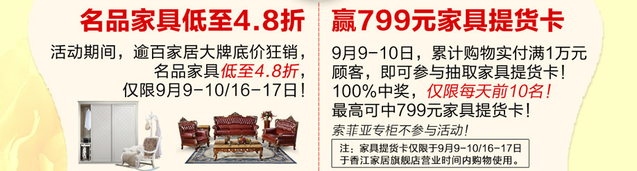 10:00-20:00 赢799元家具提货卡!名品家具免费拿!(仅限9月9日-10日)
