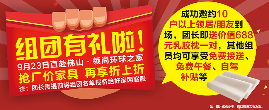 活动介绍: 燃爆啦!9月23日佛山·领尚环球之家【30万方家居工厂联盟直销平台 盛大开业】暨家居生活MALL购物嘉年华启动!千家工厂联盟,万件产品任你抢!来领尚环球之家,给您一站式家居购物服务体验!活动期间,不仅满足您的家居产品选购,还有惊喜好礼等着您!55寸液晶电视、三门冰箱、电饭煲等豪礼一一等您领回家!看家具,享豪礼!喜事多多,特惠多多!您还有什么理由不来!快上实惠家报名参加活动吧!