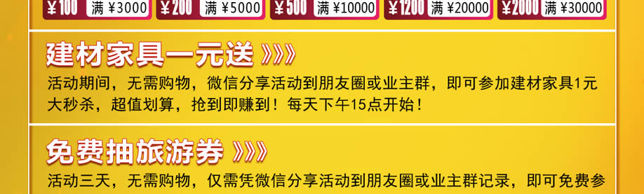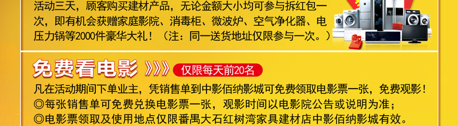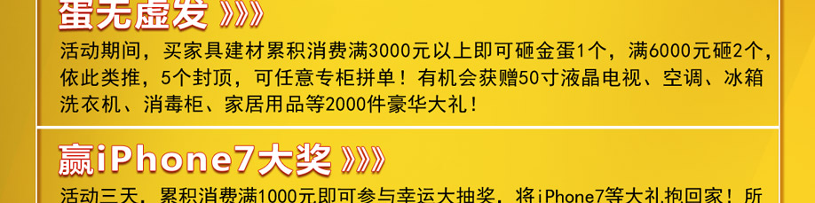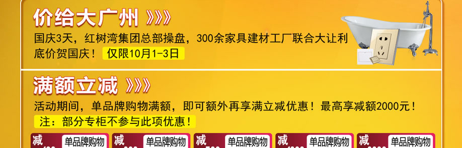 活动介绍: 玩转价期,钜惠拿回家!10月1-3日国庆假期三天,红树湾集团总部操盘,联手好家网举办【国庆建材惠战“价”给大广州】大型建材促销活动!200余家具工厂大让利!活动期间,到场顾客无需购物,即可参与落地扇、国外旅游券等抽取;消费满额即可砸金蛋,100%中50寸液晶电视、空调、冰箱、洗衣机等豪礼;还可参与iPhone7疯狂大抽奖;更有4999元现金返现等您来抽!赶紧在实惠家报名锁定优惠折扣吧!