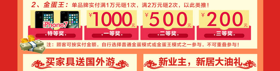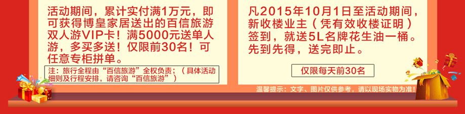 活动介绍: 金秋十月,举国同庆!芳村博皇家居10月1-3日迎来店庆15周年,【家具狂欢节】疯狂大促!家具低价钜献,特惠狂野来袭!单品牌正价消费满2000即可返1000元!还有百万现金等你来砸,蛋王还可赢iPhone7!买家具还有双人游大放送!更实惠的价格,更惊喜的环节,活动前来即可享受!狂欢即在10月1-3日,好假期与你享特惠!实惠家报名参与,快来行动吧~