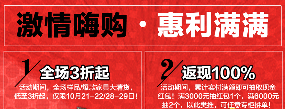 活动介绍: 大清货啦!最惠不过清货时!10月21-22/28-29日香江家居旗舰店携手实惠家举办【家具大清货】活动!现代客厅/软床床垫/板式/板木套房/实木/儿童/欧美/红木家具全品类清样!全场样板/爆款3折起钜惠!消费满额即可抽红包,100%中现金,最高可中现金1000元!另可参与3888元、1888元现金大抽奖等优惠!全场清货,限此4天!数量有限,售完即止!抢先报名,锁定折扣!