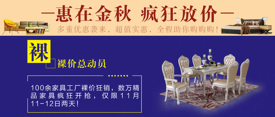 活动介绍: 这个双十一,怎可没优惠?深圳新大明家居劲爆开抢啦!11月11-12日【裸价大决战 家具总动员】促销大降价!百万家具裸价狂奔,买家具再享钜惠好礼!多重优惠袭来,超值实惠,全程助你购购购!活动期间,消费满额即送家电,电视机、冰箱等礼品带回家!买家具还可赢4999大免单、参与红包拆不断活动!惊喜让你收获满满!快上实惠家报名,这个双十一,惊喜裸价家具、豪礼带回家吧!