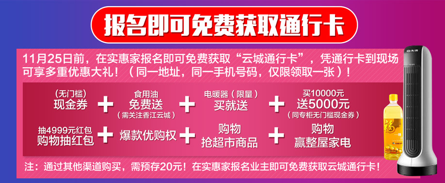 特别提示:应举办方规定,实惠家是本次活动指定报名登记渠道,所有参与业主须在本页面(上方左侧或下方图标)报名,报名登记成功方可享受活动的所有优惠环节,活动前会有客服致电告之详情。如对报名成功与否有疑问,可致电020-32038939查询→。