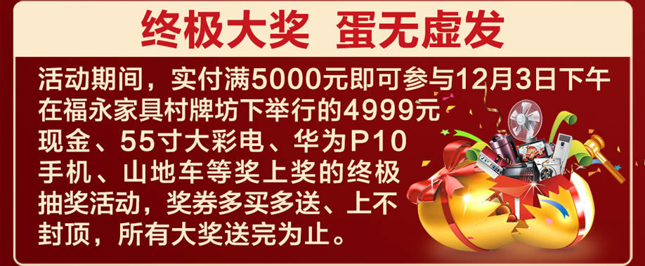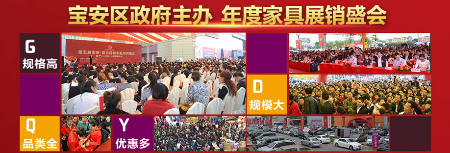 活动介绍: 感恩九载 全城分红!由深圳市宝安区人民政府主办的高规格家具展销会—第九届宝安福永国际家私节将于11月25日-12月3日(为期9天)隆重举办!活动期间,七大主题卖场、数百万款家具优惠大放送!实付满2000元,即可赢取全屋家电、黄金、彩电、现金等超级大礼,100%中奖!还有金蛋砸出幸运免单返现,最高可赢取4999元!更有90000爆款等你拿!活动仅限11月25日-12月3日!快上实惠家报名参与吧!