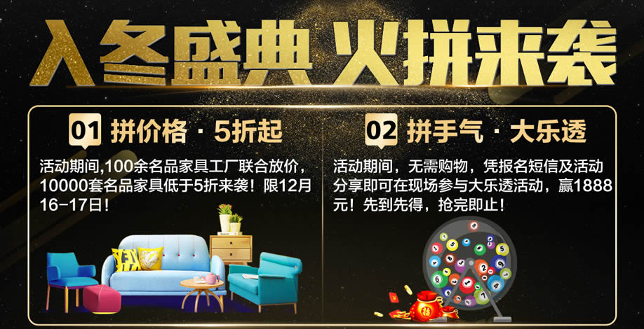 活动介绍: 年终家具盛宴,火热来袭!12月16-17日,香江家居中山店携手实惠家共同举办【家具火拼日】活动!100余名品家具工厂联合放价,10000套大牌名品家具低于5折来袭!活动期间,享6重大礼钜惠!消费满额即可获赠冰箱、微波炉、电饭煲等家电豪礼!更有金条等你来拿!来现场还可免费参加大乐透,1888元带回家!更有188个免单大奖,可赢免单4999元!享实惠,一起来嗨翻全场!准备好了就来实惠家报名吧!好机会不容错过!