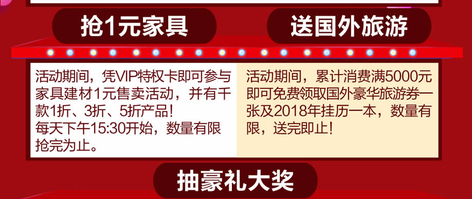 活动介绍: 建材【年博会】来啦!红树湾番禺总店联手实惠家举办大型促销活动,建材盛典,钜惠来袭!活动期间,1元抢拍风暴来袭,多重豪礼助你欢乐抢购!买建材还能参与大抽奖活动,满额还有钜惠豪礼,现金大奖等你拿!活动仅限12月16-17日2天!买建材狂省到底,拼尽全利,报名参与即可享受多重优惠,别错过啦!