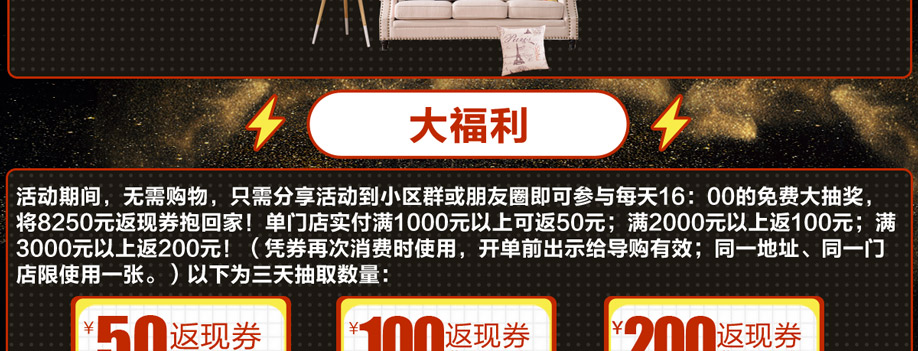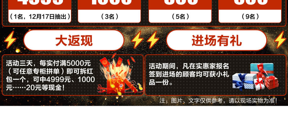 活动介绍: 年度大放送!12月15-17日金海马家居黄埔大道店联合实惠家举办【 收官大作 免单3天】大型促销活动!给您年度名品钜惠,限此三天!100多家名品工厂联合联和大促,底价来袭!惠满城,更欢乐!!惠利到家,惊喜联合放送!活动期间:无需购物即可免费参与返现券抽奖,总额8250元返现券等你来!满额即可参与拆红包,赢大奖!4999元现金大奖等您来!还有4999元大免单疯狂抽!满满惊喜!赶紧上实惠家报名参与活动吧!