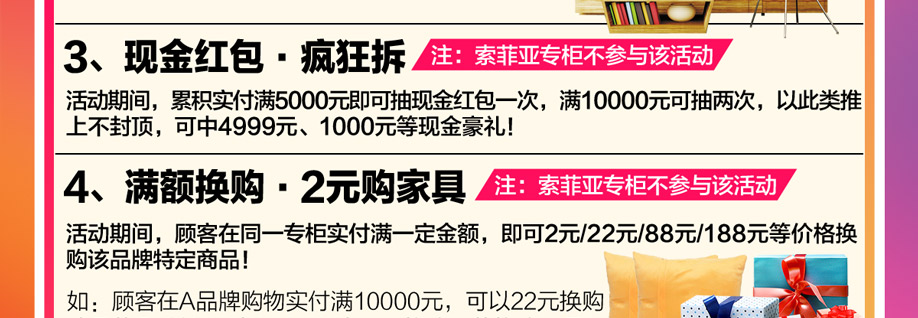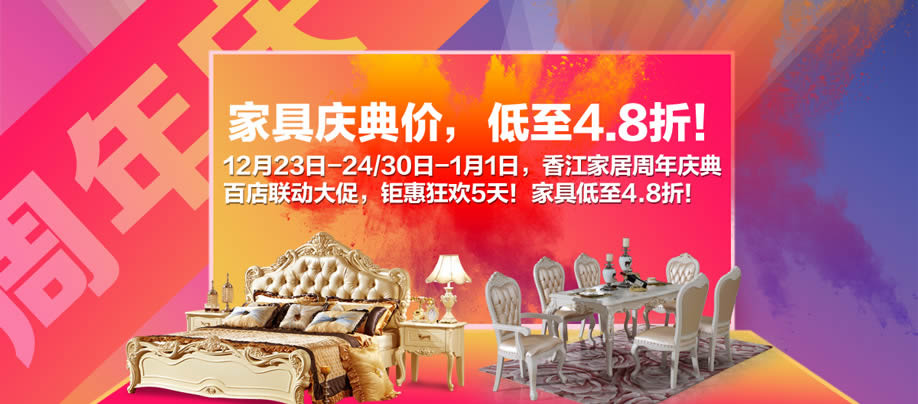 活动介绍: 周年庆典!羊城大促!买家具享受5天优惠大狂欢!12月23日-24日/12月30日-1月1日,香江家居旗舰店【2周年庆典】大型促销活动!香江家居旗舰店,邀您前来参与,共贺周年庆,同喜元旦节!百店联动大促,家具低至4.8折!活动期间,现金红包疯狂拆;满额以2元、22元等换购精品家具;满额还可将苹果两件套带回家;再有,4999元、1999元、999元......免单大奖优惠叠加!优惠不容错过!快上实惠家报名参加活动吧!