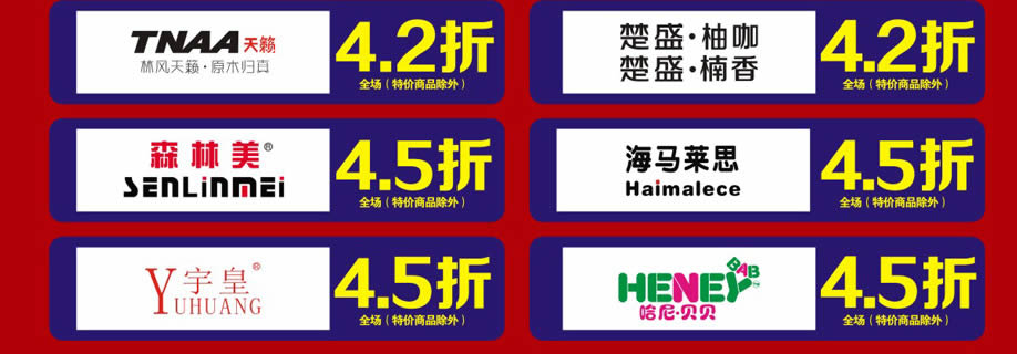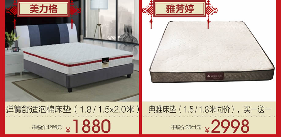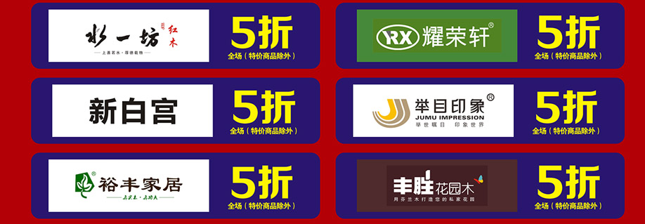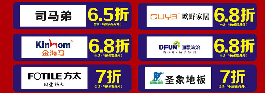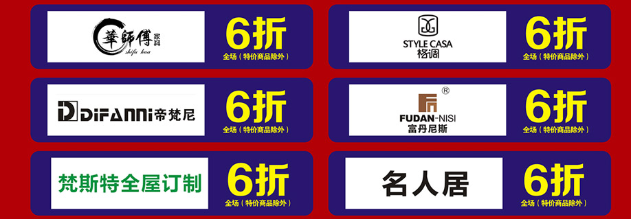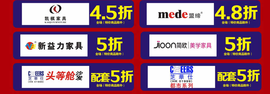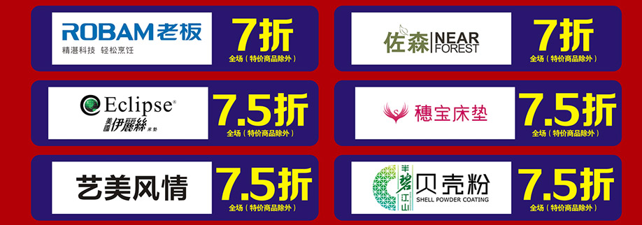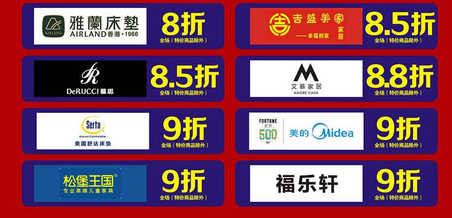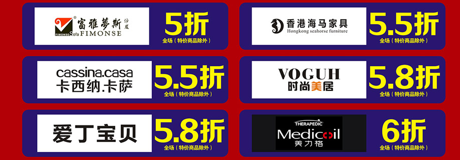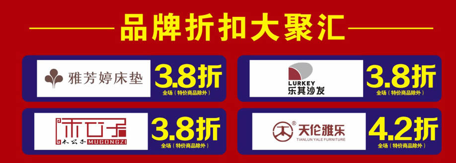 软体睡眠:慕思、芝华仕沙发头等舱、芝华仕都市系列、美国伊丽丝床垫、美力格、雅芳婷床垫、雅兰床垫、雅兰·设计师系列、美国舒达床垫、香港海马集团、金海马、穗宝床垫、海马莱思、岛之宝、福懋、香港海马家具、艾娅家居、盟缔 客厅沙发:格调、乐其沙发、富雅梦斯沙发、雅迪斯、帝梵尼、欧野家居、卡西纳·卡萨、艾慕家居、富丹尼斯、奥迪兰卡、盟缔 实木套房:华师傅、洛克、天籁、天伦雅乐、凯棋家具、裕丰家居、新益力家具、佐森、森林美、商翼美居、时尚美居、楚盛、木公子、瑞峰 定制套房:梵斯特、吉盛美家、丽维家 欧式美式:简欧、豪庭世家、90玫瑰 儿童套房:松堡王国、四季缤纷、哈尼贝贝、贝茵美、童话城堡、耀荣轩 板式板木:和风轩尼诗、举目印象 红木家具:水一坊、安哥拉 、宇皇 建材系列:圣象地板、半壁江山贝壳粉、大地硅藻泥、丰胜花园木、月影凯顿、汉颂装饰 电器系列:方太、美的、老板、盟缔 其他:艺美风情
