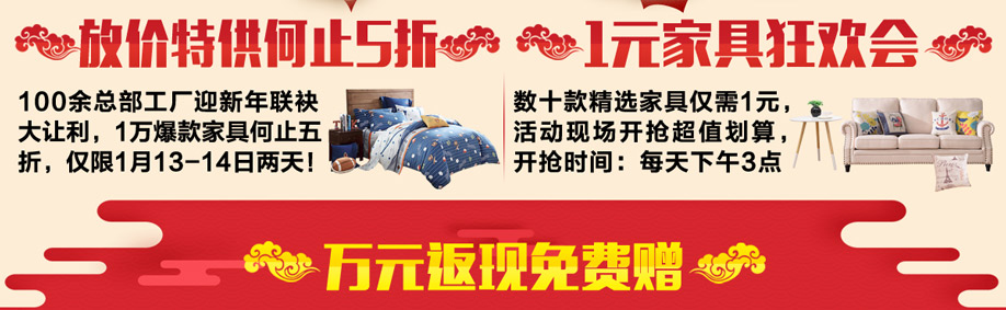 活动介绍: 2018好年迎好运,皇家1号宝安店联合实惠家开启迎新年【家居半价日】联袂大让利,仅限1月13-14日2天!活动期间,万款家具何止5折!家具优惠再享多重惊喜!活动期间,只要分享活动到朋友圈,两天上午10:30前到场即可参加疯狂大抽奖,赢取电动平衡车、42寸液晶等上百件豪礼;精选1元家具现场开抢;满额再带走50寸液晶、空调......豪豪豪!4999元年夜饭礼金、家庭影院等疯狂抽!迎年豪礼大手笔,赶快上实惠家报名参与活动吧!