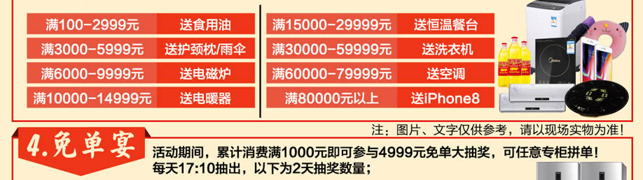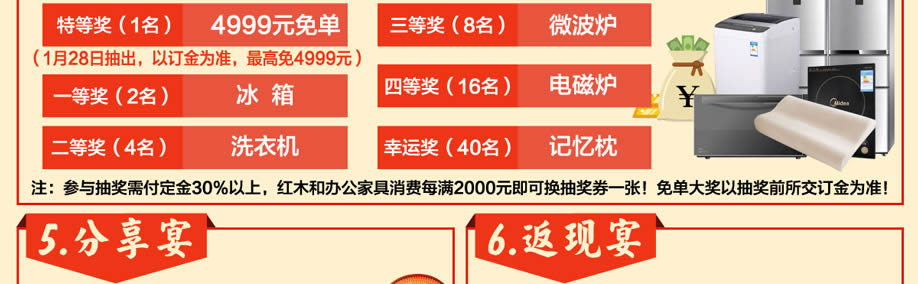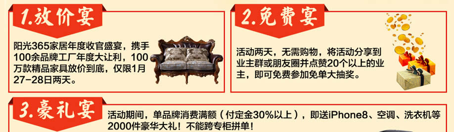 活动介绍: 真情回馈,钜惠相迎!惠顾全场,热情放送!1月27-28日,阳光365家具广场携手实惠家举办【家具收官年宴】大型家具促销活动。携手100余品牌工厂年度大让利,100万款精品家具放价到底,全城火热抢!狂欢2天:免费大抽奖;满额即送iphone8、空调、洗衣机、恒温餐台、电磁炉等豪礼;还有冰箱、洗衣机、微波炉等大礼你来抽!更多红包,惊喜好礼尽在阳光365家具广场【家具收官年宴】,马上报名参与到活动当中来吧!