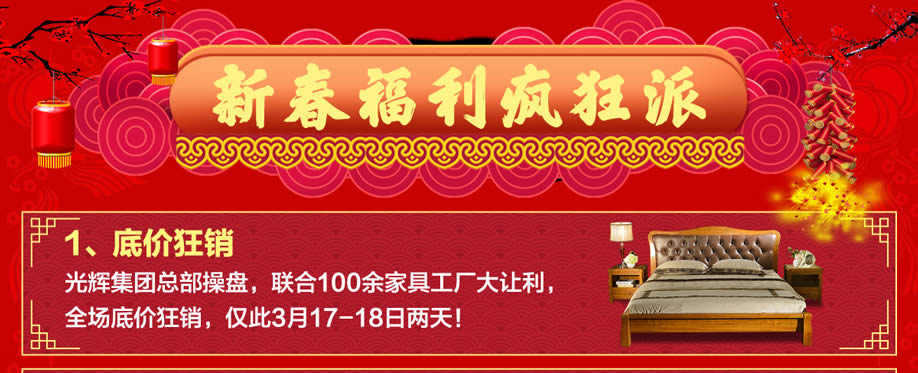 活动介绍: 新年新气象,开年享豪礼!3月17-18日光辉家居南岗店【家具狂销惠】,火爆来袭!由光辉家居集团总部操盘,全场家具一降到底!2018开年大促,打响新年第一炮!活动期间,到场即有机会参与42寸液晶电视、洗衣机等好礼免费抽;消费满额即送iPhone8、60寸液晶电视、电冰箱等豪礼;更有豪华家电等您来抽!聚划算!更多惊喜,到场揭晓!赶紧上实惠家报名参加活动吧!
