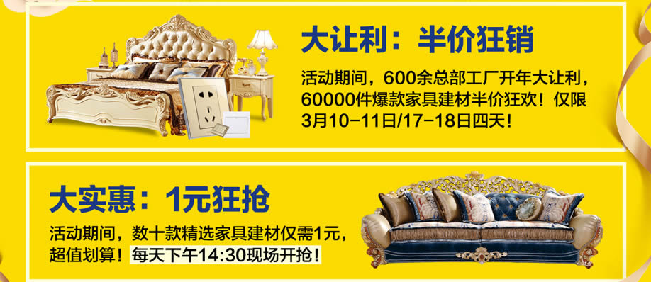 活动介绍: 开年大惠,喜庆登场!3月10-11/17-18日红树湾番禺总店【家居开年大促 半价狂欢】大型促销活动袭来!600余总部工厂开年大让利!60000件爆款家具建材半价狂欢!活动由实惠家协助举办,狂欢双周末,让你尽情嗨购!活动4天,惠聚一堂:分享活动即享好礼!满额送50寸液晶电视等家电大礼!精选家具一元抢,超值划算!更有惊喜免单4999元疯狂抽、砸金蛋等优惠!还想什么?快上实惠家报名参与活动,为您省心又省力!