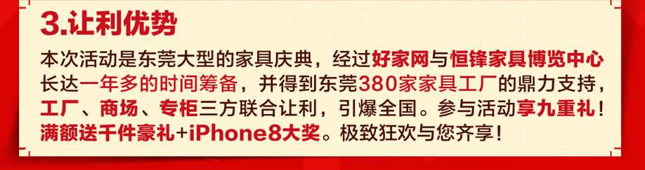 活动介绍: 庆五一,享尽“价”期!4月29日-5月1日,恒锋家具【家具工厂 五一大惠战】活动,将在东莞厚街隆重举行!东莞厚街是全国家具重镇,而恒锋家具博览中心,更是家具重镇的重中之重!活动有380家家具工厂联合让利,100万款精品家具放价展销,超值抢购!参与活动享九重礼!上网即可抢先预定,现场大抽奖,满额送家电豪礼,0元高档家具拍卖,还有iPhone8大奖等你拿!活动庆典与您享价!赶快上实惠家报名,别让“价”期溜走了!