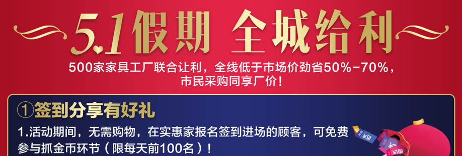 活动介绍: 5·1喜庆登场,4月29-5月1日红树湾番禺大道店【五一@店庆 优惠破天荒】!工厂迎新大让利,爆款半价狂销!活动由实惠家协助举办,狂欢过5·1!让你尽情嗨购~活动3天,惠聚一堂,分享活动即享好礼!满额还有家电等大放送!下单大奖抽抽抽!更有砸金蛋赢返现金等欢乐无限!还想什么,报名参与,超值活动为您省心再省力!