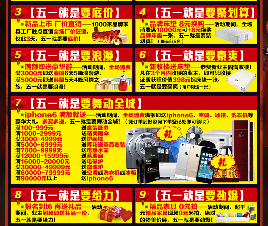 活动介绍: 5月1-3日,红树湾家具博览中心四店联动(花都店),家具行业最强音,全场震撼折扣激情上演,力度 狂超出厂价。绝无仅有,全年保价。满额即刻送iphone6、空调、微波炉等豪华大礼!满1000元即有机会参与大抽奖,赢取4999元现金,冰箱等豪华大奖!多重礼品重叠享受!万人空巷全城疯,错过即是过错!最惊爆的折扣力度,最劲爆的时尚大礼,最火爆的活动现场等待您的光临。无论您是乔迁新居还是装饰旧居,5月1-3日,来红树湾家具博览中心花都店就对了!