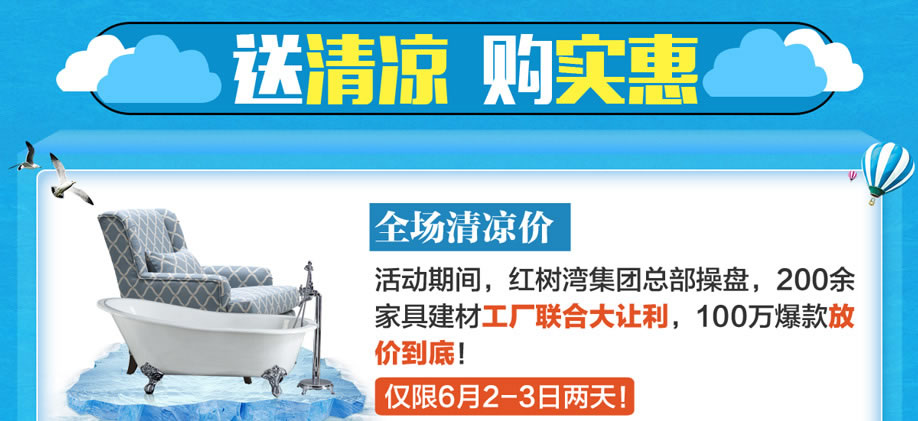 活动介绍: 邀您一起来约惠!红树湾番禺总店【清凉一夏 裸价狂欢】震撼来袭!狂欢六月,狂购2天!你准备好了吗?活动两天,200余家具建材工厂联合大让利,100万爆款放价到底!购物满额即送50寸液晶电视、冰箱、机器人扫地机等豪华大礼,还可抽取清凉家电三件套、家庭影院等大奖!红树湾番禺总店,以真诚好礼,优质服务,高质产品,超低价格,迎接您的到来!现场惠利不断,仅限6月2-3日!机会不容错过,赶快来实惠家报名,参加活动拿专属优惠吧!