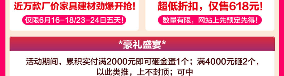活动介绍: 家具年中厂家盛典,享礼不止!6月16-18/23-24日,花都金海马家居【家具年中厂价盛典】活动大促来啦!活动期间,全场近万款爆款低价抢购!超多抵金券免费领取!还有还有!实付满额即可砸金蛋中豪华家电!累计实付满1000元还可参与幸运大奖,把空调、冰箱等豪礼抱回家!分享活动即可免费领取活动大礼包!多重优惠,多重惊喜,赶紧上实惠家报名来参与,优惠带回家吧!