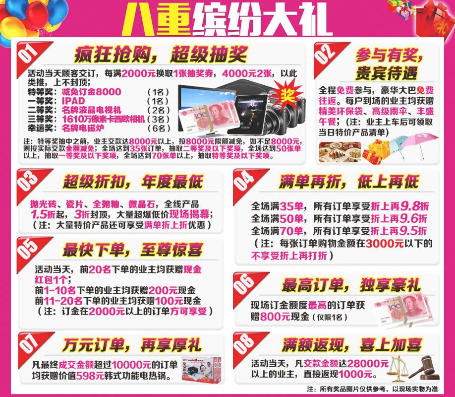 活动介绍: 5月17日2015升华陶瓷工厂开仓特卖!纵情享受陶瓷年度最低价。升华陶瓷是陶瓷十大品牌之一,2015开放工厂迎接各地业主,向广大业主放送最大优惠。活动当天,全场1.5折起、3折封顶。全场满单还可再享受折上折 ;最快下单还可抢现金,最高再返1000元。消费满额还可参与抽取8000元免单、ipad、液晶电视等豪华大礼。另外在享免费接送、签到有礼...实惠家诚邀广大业主踊跃报名参加!