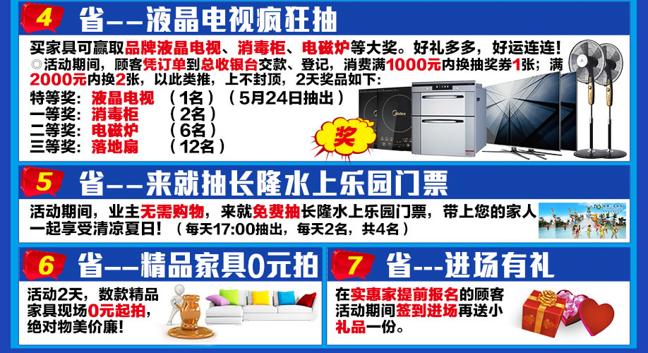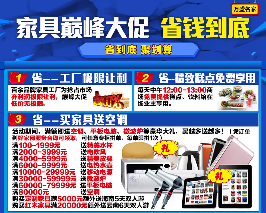 活动介绍: 5月23-24日,到万盛名家家具博览中心!家具巅峰大促,低价无极限,邀您去买实惠家具,送您长隆水上乐园门票,带你嗨翻整个夏天。置家之余,乐享生活。本活动品牌云集 ,是行业独一无二的低价盛典,2天期间,全场家具极限让利,厂价特供,买满即送空调、平板电脑,更有液晶电视、消毒柜、电磁炉等大奖疯狂抽;免费接送、报名到场即送礼、免费点心……还不心动?快来 购家具,买健康,领礼品,牵幸福,抓紧报名锁定优惠哦!别把好机会留给别人!