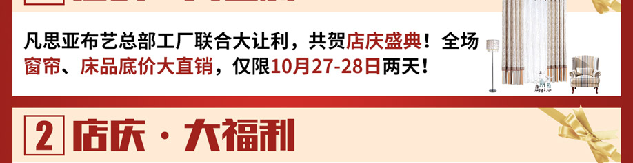 活动介绍: 一帘之美,揭开你心灵之窗,眼前一片光明!19年老牌,38道生产工艺,只为你的窗户添上更多的绚丽!10月27-28日凡思亚布艺工厂直营店 超级店庆!由凡思亚工厂总部联合大让利,共贺店庆盛典!全场窗帘、床品厂价大直销! 从工厂到家庭,全包套米计价!标准化、流程化,拒绝猫腻、谢绝烦琐。活动期间:特惠窗帘限量抢/大单返现金/店庆红包疯狂派/金蛋折扣开心砸等多重优惠!福利多多,报名进店即可享受!千万不要错过哦!