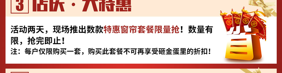 活动介绍: 一帘之美,揭开你心灵之窗,眼前一片光明!19年老牌,38道生产工艺,只为你的窗户添上更多的绚丽!11月3-4日凡思亚布艺工厂直营店 超级店庆!由凡思亚工厂总部联合大让利,共贺店庆盛典!全场窗帘、床品厂价大直销! 从工厂到家庭,全包套米计价!标准化、流程化,拒绝猫腻、谢绝烦琐。活动期间:特惠窗帘限量抢/大单返现金/店庆红包疯狂派/金蛋折扣开心砸等多重优惠!福利多多,报名进店即可享受!千万不要错过哦!