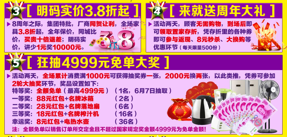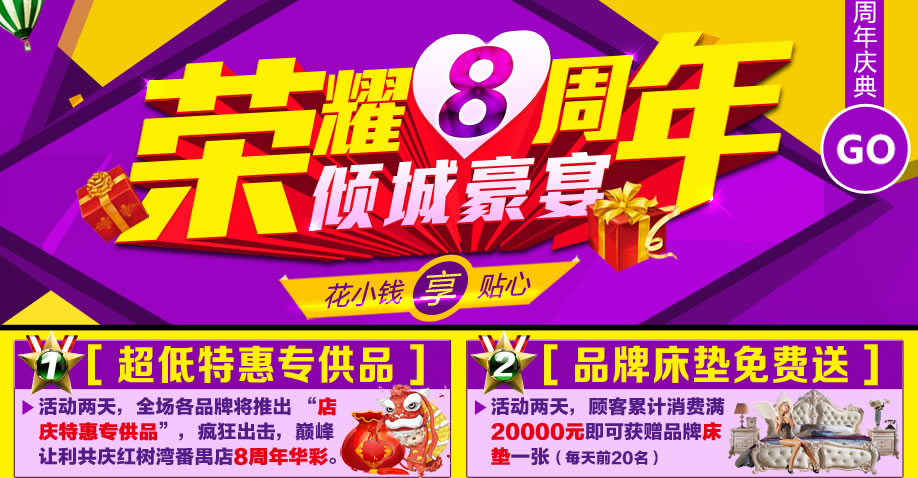 活动介绍: 6月6-7日红树湾番禺店荣耀8周年·倾城豪宴,势必要以破竹之势礼轰羊城!8周年庆典,巅峰让利共庆8年华彩;集团特批、厂商同贺让利,全场3.8折起;再送品牌家电、乳胶枕等家居用品。8载荣耀,800万红利倾情大放送;品牌床垫免费送;名品家具8元购;更有全额免单大惊喜……红树湾番禺店用高质量、优服务撰写8年辉煌;用超实惠、狂让利创造2天传奇!报名实惠家,赢取豪礼,共谱家具最强音!