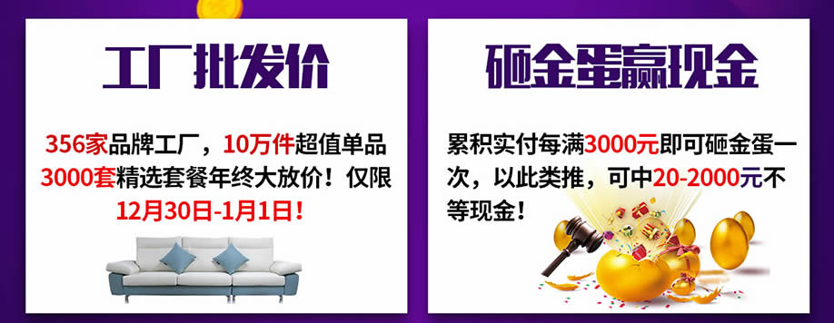 活动介绍: 12月30日-1月1日,香江家居天河店携手实惠家举办【家居年博会】大型促销活动,356家家具工厂,10万件超值单品,3000套精选套餐年终大放价!活动期间,买家具享多重优惠:砸金蛋赢20-2000元不等现金/0元送床垫/来就送见面礼/现金4999元等大抽奖!聚优惠,聚划算!更多惊喜,到场揭晓!抓紧时间报名,到实体店享受优惠啦!