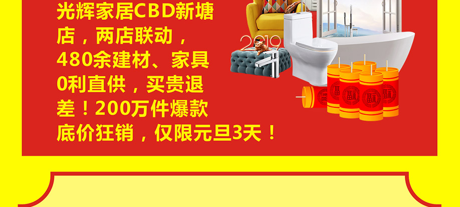活动介绍: 本次活动由光辉家居南岗店与光辉家居CBD新塘店联合举办!12月30-1月1日光辉家居CBD新塘店【建材家具破纪录】邀您一起来享惠!400余建材、家具0利直供,买贵退差!200万件爆款底价狂销!活动期间,进场签到有豪礼;5000张绒毛毯免费送;砸金蛋赢至多4999元返现;华为千足黄金、两门大冰箱等现场大抽奖!两店联动,一站购齐!多重优惠,多重惊喜,欢乐不断,抓紧时间报名,到实体店享受优惠啦!