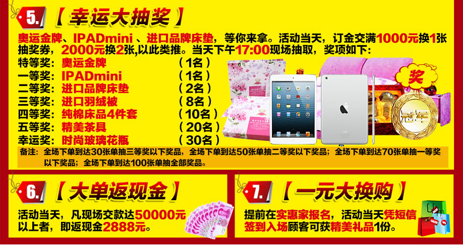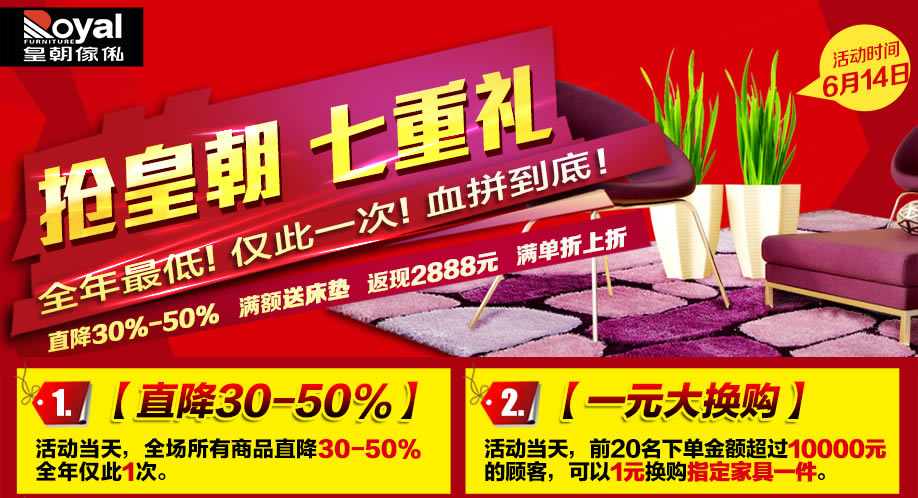 活动介绍: 抢皇朝家具啦!!应广大业主强烈要求,实惠家与皇朝家私集团总部经过半年精心筹备,定于6月14日举办千人抱团抢皇朝的大型促销活动。本次活动直赴皇朝集团总部工厂,工厂开仓直供,皇朝家私总裁特批价,直降30%-50%!活动当天,满额即送进口床垫等,买越多送越多;下单达到指定单数,还可享受折上再折;最高返现2888元;精品家具1元换购等……还有奥运金牌、ipad mini等大奖等你抽回家!赶紧报名实惠家报名参与吧!