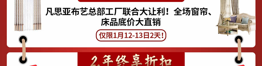 活动介绍: 一帘之美,揭开你心灵之窗,眼前一片光明!19年老牌,38道生产工艺,只为你的窗户添上更多的绚丽!1月12-13日凡思亚布艺工厂直营店 年终盛典!由凡思亚工厂总部联合大让利!全场窗帘、床品厂价大直销! 从工厂到家庭,全包套米计价!标准化、流程化,拒绝猫腻、谢绝烦琐。活动期间:大单返现888元/下单送泰国旅游/砸金蛋疯狂返现/红包折扣开心拆等多重优惠!福利多多,报名进店即可享受!千万不要错过哦!
