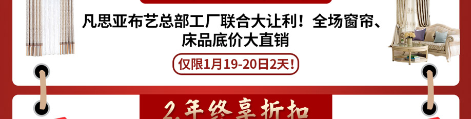 活动介绍: 一帘之美,揭开你心灵之窗,眼前一片光明!19年老牌,38道生产工艺,只为你的窗户添上更多的绚丽!1月19-20日凡思亚布艺工厂直营店 样板清货会!由凡思亚工厂总部联合大让利!全场窗帘、床品厂价大直销! 从工厂到家庭,全包套米计价!标准化、流程化,拒绝猫腻、谢绝烦琐。活动期间:大单返现888元/下单送泰国旅游/砸金蛋疯狂返现/红包折扣开心拆等多重优惠!福利多多,报名进店即可享受!千万不要错过哦!