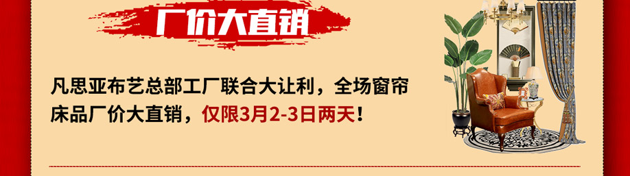 活动介绍: 一帘之美,揭开你心灵之窗,眼前一片光明!19年老牌,38道生产工艺,只为你的窗户添上更多的绚丽!3月2-3日凡思亚布艺工厂直营店 工厂内购会!由凡思亚工厂总部联合大让利!全场窗帘、床品厂价大直销! 从工厂到家庭,全包套米计价!标准化、流程化,拒绝猫腻、谢绝烦琐。活动期间:1元抵用100元/下订返现金/指定窗帘8.8折/红包豪礼开心拆等多重优惠!福利多多,报名进店即可享受!千万不要错过哦!