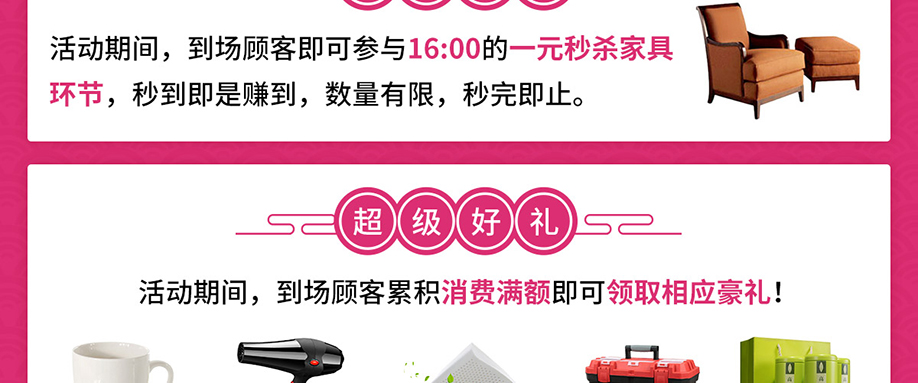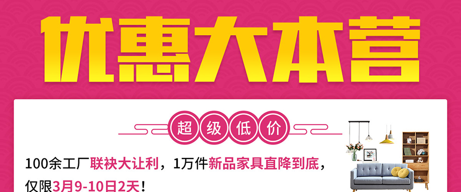 活动介绍: 3月9-10日由红树湾家具荔湾店联合实惠家举办的【家具超级放价惠】大型促销活动!上百家品牌工厂迎新大让利,8000套爆款家具底价大促!周年庆典,惠聚一堂,仅此2天!活动期间,名品家具11元秒;狂返百万现金;砸金蛋中现金;疯狂抽55寸液晶电视、空调;惊喜赢4999元现金!惊喜不断,钜惠不停,还想什么,赶紧报名参与,到店享受优惠啦!