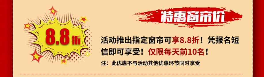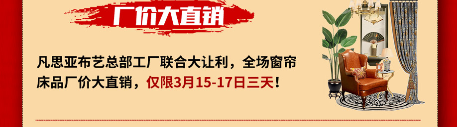 活动介绍: 一帘之美,揭开你心灵之窗,眼前一片光明!19年老牌,38道生产工艺,只为你的窗户添上更多的绚丽!3月15-17日凡思亚布艺工厂直营店 超级内购会!由凡思亚工厂总部联合大让利!全场窗帘、床品厂价大直销! 从工厂到家庭,全包套米计价!标准化、流程化,拒绝猫腻、谢绝烦琐。活动期间:1元抵用100元/下订返现金/指定窗帘8.8折/红包豪礼开心拆等多重优惠!福利多多,报名进店即可享受!千万不要错过哦!