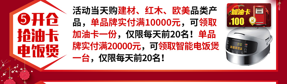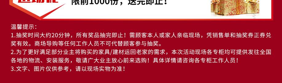 活动介绍: 4月13-14日红树湾国际家具建材中心 【开仓日】火爆来袭!10000件名品建材、家具、家电一降到底;消费满额立减现金;4000油卡任性送;开仓满额送家电;砸金蛋赢家居/家电/现金等豪礼;再抽65寸液晶电视……钜惠火爆来袭,优惠报名即享!