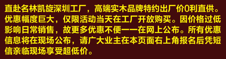 活动介绍: 直赴高端实木家具品牌工厂,畅享全系列出厂价!9月21日,实惠家携手全国广大业主一起走进高端实木家具名林凯旋工厂抢厂价!特约厂价惠,0渠道买大牌!进厂即送精美礼品,还可以100元购买特惠卡,直接抵现500元;你买家具,路费由我报销,最高补贴300元;消费满额再送乳胶枕、抽取实木大床等豪华大礼!名林凯旋品牌定位较高端,进工厂买家具,既实惠又正品!本次活动产品仅适用于大户型、复式、别墅类业主!心动价现场一一揭晓,敬请有需要的业主报名参与!